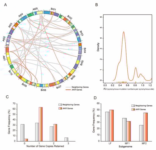 Next, we compared the retention of A. thaliana AKR genes relative to the set of their neighboring genes (ten on either side, flanking the AKR genes) in B. rapa (Figure 3A,C). Only one (4.5%) AKR in B. rapa was completely lost, which was less than the loss in neighboring genes (~31%). Most AKRs were retained in one (63.6%) or two (31.8%) copies, which is significantly greater than the retention of the neighboring genes. No AKR was retained in three copies, but 6.7% of the neighboring genes were retained. The degree of retention between AKR and neighboring genes were varied among the three sub-genomes of B. rapa. Compared to the neighboring genes, more AKR homologs were retained in the MF2 sub-genomes (Figure 3A,D). This indicates that the homologs in MF2 contributed to the retention of AKR genes. Why did this sub-genome contain more homologs that were not consistent with those shown in a previous report by Wang et al. (2011) []? We further explored the gene duplication types of AKR genes to answer this question. All the syntenic gene pairs were identified non-randomly on the GBs (the conserved ancestral genomic blocks labeled A–X) between the B. rapa and A. thaliana chromosomes (Supplementary Figure S3A). By counting the homologs on the same GBs in B. rapa, 26.7% of the AKR genes were shown have experienced segmental duplication events (Supplementary Figure S3A). Furthermore, specific duplicated types of AKR genes and all genes in B. rapa were identified by the MCScanx program. We also noted that less segmental duplication was observable in AKR genes than at the whole genome level in B. rapa (Supplementary Figure S3B). Surprisingly, a great deal (37.9%) of tandem duplication was observable in the AKR genes, most of which were found in the MF2 sub-genome (Supplementary Table S5), which answers the previous question.