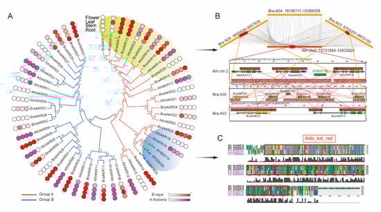 Expression patterns and evolutionary characteristics of aldo-keto reductases (AKR) genes in A. thaliana and B. rapa. (A) Phylogenetic relationship and expression pattern of AKRs in A. thaliana and B. rapa. The tissue expression analysis included root, stem, leaf, and flower. (B) Micro-syntenic analysis of part of the AKR genes in A. thaliana and B. rapa genome. (C) Multiple sequence alignments of GalUR orthologs.