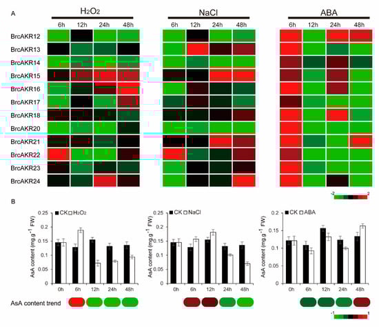 We also investigated the relationship between the expression patterns of GalUR candidate genes and AsA content under multiple stress treatments, including H2O2, NaCl, and abscisic acid (ABA). These stress treatments can all induce oxidative stress directly or indirectly and change the AsA content in plants []. The expression patterns of these GalUR candidate genes showed divergent responses to these stresses, and most genes were strongly induced at different time points (Figure 5A). In particular, the transcript levels of all genes were significantly up-regulated at 6 h under ABA stress. One possible reason for this result is that AKRs might participate in the regulation of NADPH oxidase activity in ABA signal transduction []. Under H2O2 and NaCl stresses, the expression trend was relatively complex, and the transcript levels of most genes were reduced. In detail, the expression levels of most genes did not show a clear upward trend at the beginning, except for BrcAKR22. However, the transcription of some genes was activated as time progressed, including BrcAKR13, 15, 21, and 24 (Figure 5A). Overall, the AKR genes were more complex in response to multiple stresses, and homologous genes manifested a significant functional divergence. Meanwhile, the AsA content was also measured under these stresses. Under H2O2 stress, the AsA content increased at 6 h and then decreased. Under NaCl stress, the levels increased prior to 12 h and then decreased. Under ABA stress, the AsA content continuously decreased until 48 h, at which point they significantly increased (Figure 5B). Only the expression pattern of BrcAKR22 was consistent with the changes in AsA content under H2O2 and NaCl stress (Figure 5).