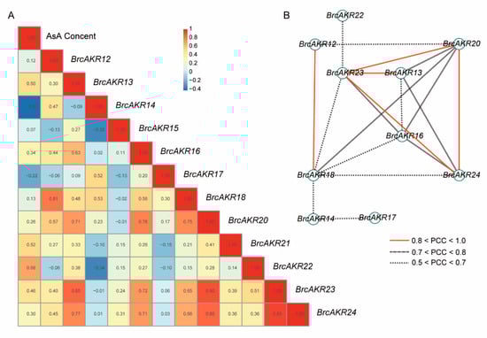 To clearly understand the connection between the transcript levels of AKR genes and AsA content, the Pearson correlation coefficients (PCCs) were established between the AsA content and the relative expression trends of the genes. Three genes, including BrcAKR13, 21, and 22, appeared to have a positive correlation (PCC > 0.5) with AsA content, particularly BrcAKR22, which had a PCC of 0.68 (Figure 6A). Through this co-expression relationship, the divergences between homologous genes were further clarified (Figure 6A).