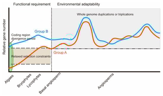 The AKRs were divided into two distinct groups, groups A and B (Figure 1A,B). Compared to the group B AKRs, group A AKRs gradually increased from algae to A. trichopoda (basal angiosperm). This is possibly a functional requirement since land plants require more complex environmental adaptability than algae. This process caused group A AKR genes, such as AKR4C9 and GalUR, to obtain greater neofunctionalization. These genes have been confirmed to play important roles in plant developmental processes, especially in resisting the multiple stresses in angiosperms [,,]. Based on a selective pressure analysis, group A AKRs experienced increasingly more relaxed selection constraints from bryophytes to basal angiosperm. During this period, group A AKRs could have experienced positive selection, which allowed new duplicate genes to branch into different functions. Thus, the functional requirements could explain the rapid expansion of group A AKRs before the origin of the angiosperms. However, the genome evolution of angiosperms is characterized by polyploidization, which is typically accompanied by different gene duplications []. The rapid expansion of group A AKRs and all AKRs was diversified in different plant species. Different species have different growth environments and morphological developments. Different species also experience different whole-genome duplication (WGD) or whole-genome triplication (WGT) events.