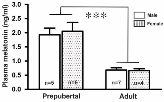 Measurement of plasma melatonin levels in prepubertal and adult mice in both sexes showed that the plasma melatonin levels (1.99 ± 0.25 ng/mL, n = 11) in prepubertal mice were threefold higher than those (0.67 ± 0.06 ng/mL, n = 11) in adult mice. However, there were no significant differences between the male and female groups in either the prepubertal (males, 1.93 ± 0.24 ng/mL, n = 5; females, 2.05 ± 0.31 ng/mL, n = 6) or adult mice (males, 0.68 ± 0.08 ng/mL, n = 7; females, 0.66 ± 0.07 ng/mL, n = 4), as shown in Figure 1.