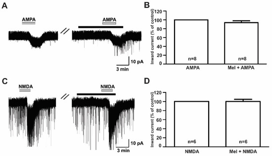 Effects of melatonin on α-amino-3-hydroxy-5-methyl-4-isoxazolepropionic acid (AMPA)- and N-methyl-D-aspartic acid (NMDA)-induced responses. (A,C) Representative traces showing inward currents induced by AMPA (10 µM) and NMDA (30 µM) in the absence and the presence of 10 µM melatonin. The black bars represent the duration of the melatonin application. (B,D) Bar graphs showing the mean relative percentage of inward currents induced by AMPA and NMDA in the absence and the presence of 10 µM melatonin (p > 0.05; paired t-test). n, the number of neurons tested; Mel, melatonin.