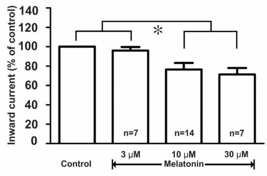 Histogram showing the mean relative percentages of inward currents induced by kainate (10 µM) in the absence and the presence of various concentrations (3, 10, and 30 µM) of melatonin. (* p < 0.05; one-way ANOVA post-hoc Scheffe test). n, the number of neurons tested.