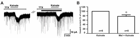 To examine whether melatonin directly modulated the effect of ionotropic glutamate receptor agonists on GnRH neurons, we investigated the effect of melatonin in the presence of tetrodotoxin (TTX), a voltage-gated sodium channel blocker. We found that melatonin suppressed the kainate receptor-mediated response in the presence of TTX (TTX + kainate, −14.1 ± 1.26 pA; TTX + melatonin + kainate, −10.9 ± 1.56 pA, n = 8, p < 0.05; paired t-test, Figure 6A). The mean relative percentage of inward currents induced by kainate in the presence of TTX and melatonin compared to kainate with TTX was 76.0 ± 6.0% (n = 8, p < 0.05; paired t-test, Figure 6B).