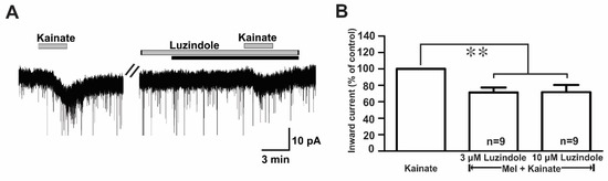 Melatonin exerts its influence by binding to two specific G protein-coupled receptors (GPCRs), namely, MT1 and MT2 [10]. To assess which melatonin receptors were involved in the suppression of kainate response, we used luzindole, a melatonin MT1 receptor antagonist, or an MT2 antagonist. In the presence of luzindole (3 µM and 10 µM), the melatonin-induced suppression of kainate receptor-mediated responses was maintained (Figure 7A). The mean relative percentages of inward currents induced by kainate in the presence of luzindole and melatonin compared to kainate with luzindole were 71.0 ± 6.0% (3 µM luzindole, n = 9) and 71.0 ± 8.0% (10 µM luzindole, n = 9), respectively (p < 0.05; paired t-test, Figure 7B).