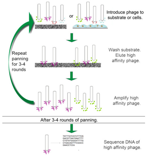 Typically, phage display with a random peptide library consists of multiple rounds of biopanning, in which a phage library is exposed to the substrate of interest and the highest affinity binders are recovered (Figure 1) [7]. Care must be taken to wash the substrate thoroughly in each panning step to ensure that non-bound or weakly bound phages are removed. Once bound phages are eluted off the substrate, they are used to infect bacteria for amplification of the phages. Colonies can be harvested, and the phages can be isolated for another round of panning and/or for sequencing. After multiple rounds of panning, the highest affinity binders can be identified, characterized, and tested for their specificity to the desired substrate in order to identify the top candidates.