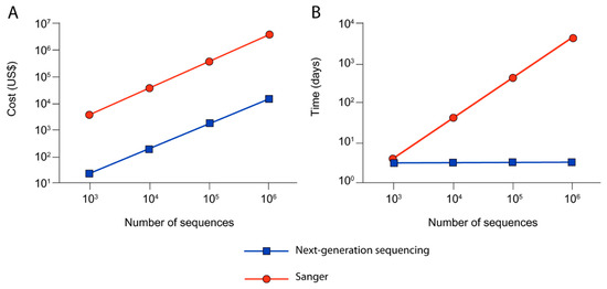 These graphs demonstrate how (A) cost and (B) time necessary for phage sequencing decreases when using next-generation sequencing (blue) over traditional Sanger sequencing (red) for increasing numbers of sequences. Images modified from [15] and used with permission from PLoS ONE.