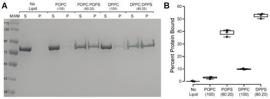 To ensure that the recombinant proteins used in the current study have similar lipid-binding characteristics as the ones described in the literature, we first used the lipid vesicle sedimentation (LVS) assay and quantified the binding of HspA1A to different species of PC and PS. In agreement with the published literature [6,7,8,9,11], these experiments revealed that all three protein batches used in the current study bind to PS species significantly higher than to any of the PC species used (Figure 1 and Supplementary Figure S1). Furthermore, our results revealed that HspA1A binds to DPPS significantly more than to POPS (Figure 1B).