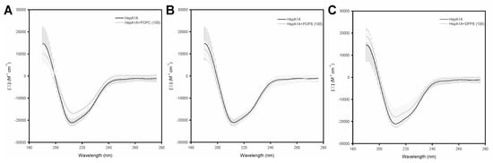Circular dichroism (CD) experiments reveal subtle alterations of the secondary structure of HspA1A in the presence of different lipids. Mean residue CD extinction coefficient values (Δε in Μ−1·cm−1) were plotted and analyzed using the CD Analysis and Plotting Tool. Experiments were performed using three different protein batches, and the bars represent standard deviation (SD). The graphs compare the Δε values between HspA1A alone (black line) and HspA1A supplemented with (A) POPC, (B) POPS, and (C) DPPS liposomes.