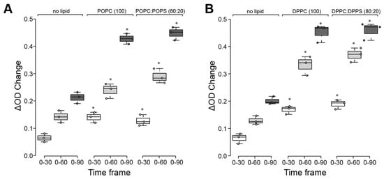 The presence of lipids, but not lipid-binding, increases the ATP hydrolysis activity of HspA1A. A colorimetric assay measuring the amount of free inorganic phosphate (Pi) was used. No HspA1A containing samples were used to control for spontaneous ATP hydrolysis, and the corresponding optical density (OD) values were subtracted from the samples’ values. The experiments were performed in the absence or presence of (A) POPC and POPC:POPS and (B) DPPC and DPPC:DPPS liposomes. The data are plotted as OD change (ΔOD) and are presented for three different periods (time frame). Each experiment was repeated three times. In all graphs, centerlines show the medians; box limits indicate the 25th and 75th percentiles as determined by R software; whiskers extend 1.5 times the interquartile range from the 25th and 75th percentiles. A p-value <0.05 is denoted with a *. The p-values of the statistical tests are provided in Supplementary Table S1.
