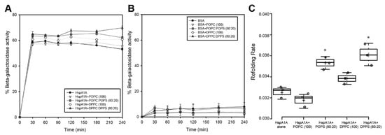 The binding to phosphatidylserine results in a small but consistent increase of the refolding activity of HspA1A. In these experiments, β-galactosidase was chemically denatured and the recovery of the enzyme’s activity was determined by hydrolysis of ortho-nitrophenyl-β-galactoside as compared to the activity of the native enzyme. (A). The data are plotted as percent of activity based on the activity of the native β-galactosidase; (B) BSA and reactions with no enzyme were used as negative controls; (C) The refolding rate was calculated by using the linear regression line of all time points. A p-value <0.05 is denoted with a *. The p-values of the statistical tests are provided in Supplementary Table S1.