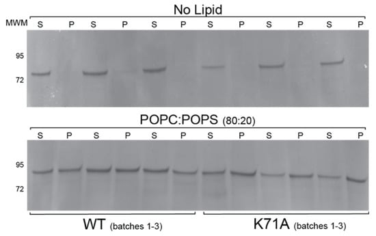 The K71A mutation binds to liposomes containing phosphatidylserine higher than the wild-type HspA1A. In these experiments, a single concentration of liposomes (1 mM total lipid) was used composed of POPC:POPS (80:20 mol:mol) incubated with 1 μM of protein. SDS-PAGE gel electrophoresis of the supernatant (S) and pellet (P) fractions of wild-type and K71A HspA1A without liposomes (Top; negative control) and with liposomes composed of POPC:POPS (80:20 mol:mol).