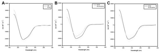 We then determined the effect of lipids on the secondary structure of the K71A mutation using CD spectrometry using the conditions and rational described in Section 2.3. These experiments revealed that the mutation does not cause major alterations on the secondary structure of the protein (Figure 6A) with the exception of a small decrease in the α-helical regions of the protein. The incubation of the K71A with POPS caused a consistent, between biological replicates, loss of the α-helical regions and a substantial but not consistent between replicates increase at the β-strand regions of the protein (Figure 6B). Differently, the presence of DPPS liposomes, in which HspA1A binds and embeds, resulted in a small decrease of the β-strand regions of the protein (Figure 6C).