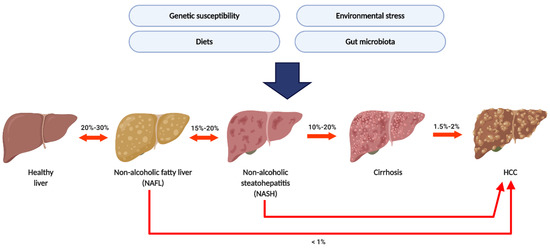 Generally, NAFLD progression can be divided into four pathological stages, including non-alcoholic simple fatty liver (NAFL), non-alcoholic steatohepatitis (NASH), hepatic cirrhosis, and HCC [10] (Figure 1). Recent epidemiological studies showed that the average prevalence rate of NAFLD appeared to be higher in Asia (27%) than in the United States (24%) and Europe (23%) [7,8,11]. NAFLD-related health issues have attracted global attention since NAFLD is increasingly becoming the most common cause of hepatic cirrhosis and HCC [9,12]. NAFLD patients who remain in the NAFL stage show a much lower risk of developing HCC than NASH patients. Chronic and repetitive hepatocyte damage and repair in steatohepatitis may lead to advanced fibrosis, cirrhosis, and HCC, thus causing mortality within a few decades. Moreover, no FDA approved medication for NAFLD treatment exists presently. Therefore, there is an urgent and unmet need for a better understanding of NAFLD pathogenesis and progression to HCC.