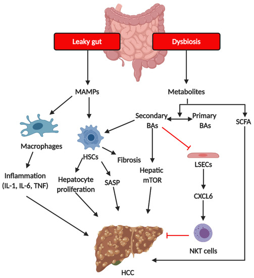 NASH progression to HCC shows mechanisms similar to those of NAFL progression to NASH. Dysbiosis and a leaky gut result in PAMP and gut microbiota-derived metabolite influx into the liver, thereby further triggering hepatic inflammation and disrupting metabolism homeostasis. Several groups of bacteria were associated with HCC. A previous study showed E. coli overgrowth in the intestines of HCC and cirrhosis patients [102]. Another study indicated that HCC patients, compared to cirrhosis patients, exhibited increased levels of Bacteroides and Ruminococcaceae spp. [103,104] and decreased levels of Akkermensia and Bifidobacterium spp. [104]. At the molecular level, PAMPs, such as LPS, activated signaling of TLRs, including TLR4 and TLR9, and induced cytokine and chemokine production, further inducing immune cell infiltration into the liver. PAMPs also activated HSCs via TLR activation to senescence-associated secretory phenotype (SASP) and induced epiregulin production, further promoting fibrosis development [105,106] (Figure 5). Dysbiosis affects metabolic functions via the gut microbiota-derived metabolites in NASH progression to HCC, like in NAFL progression to NASH. Primary BA conversion to secondary BAs by the gut microbiota is involved in HCC pathogenesis. Dysbiosis promotes HCC by inhibiting primary BA production, further inhibiting LSEC activation. Inhibition of LSEC activation results in chemokine ligand 6 (CXCL6) down-regulation, CXCL6-mediated natural killer T cell recruitment, and further loss of liver tumor growth control [107]. On the other hand, secondary BAs promote HCC development by activating HSC SASP and the hepatic mTOR pathway [108]. Thus, controlling the production of secondary BAs using antibiotics reduces HCC development [109] (Figure 5).