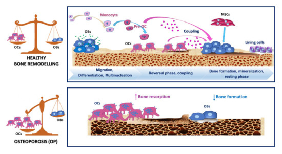 OP is one of the most severe bone disorders worldwide, affecting about 200 million patients [1], mainly in post-menopausal women and older people. The key feature of OP is a deterioration of the bone composition and subsequent bone fragility, leading to a severe risk of bone fractures [86]. OP has a multifactorial aetiology. Post-menopausal and senile forms of OP are the most common. They are caused by oestrogen loss and calcium deficiency with a critical role of the immune system in their physiopathology [87]. The secondary types of OP, which are triggered by diseases (such as RA, diabetes mellitus), use of drugs (such as glucocorticoids) and improper inhabits (such as nutritional deficiency, smoke etc.), and idiopathic juvenile OP are less widespread [88]. The uncoupling of bone resorption and bone formation (Figure 2) is the primary pathogenetic process in OP [89,90]. Biological mechanisms involved in this complex phenomenon are several and still partly unknown. Increased osteoclastogenesis and OCs lifespan and decreased osteoblastogenesis and OBs function occur in OP. Changes in local and systemic growth factors or hormones influence bone tissue. In specific, oestrogen contribute to the inhibition of OCs by reducing RANKL on marrow cells and increasing OPG secretion by OBs. Oestrogen increases the thiol antioxidants defences in OCs and suppress TNF-α [91]. During post-menopausal OP, oestrogen decline contributes to increasing RANKL secretion by OBs and osteocytes, which in turn increases bone resorption [92,93].