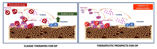 Graphical representation of classic and new therapeutic prospects for OP. The left panel illustrates standard remedies for OP, divided into two classes: anti-catabolic and anabolic drugs. The first class inhibits bone resorption by targeting either the differentiation, resorptive function, cytokines production by osteoclasts (OCs). The second class builds up bone architecture, stimulating osteoblasts (OBs) and their precursors. The right panel outlines new therapeutic prospects for OP. It refers to inhibitors of multinucleation, which would preserve the OCs precursors to support the OCs-OBs coupling.
