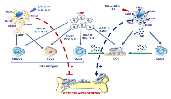 Graphical representation of factors modulating osteoclasts (OCs) and giant cells (GCs) formation. M2 macrophages, induced by IL-4, IL-10, IL-13 and IL-21, can release anti-osteoclastogenic factors (AOF), which promote foreign-body giant cells (FBGCs) and Touton giant cells (TGCs). Hematopoietic monocyte/macrophages precursors (HMP) under (i) GM-CSF, IL-4 and IL-13 can originate FBGCs; (ii) M-CSF, INF-γ, and IL-6 stimuli can induce Touton cells (TGCs); and (iii) GM-CSF, INF-γ and IL-3 can produce Langhans giant cells (LGCs). FBGCs, TGCs and LGCs represent the main three subtypes of GCs, displaying distinct histological and functional features. HMP can originate mature OCs after M-CSF and RANKL stimulation. M1 macrophage, induced by TNF-α, LPS and INF-λ, release osteoclastogenic factors (OF), which promote OCs and LGCs. LGCs can release OF, which in turn support the OCs differentiation. M2 macrophages inhibit osteoclastogenesis by releasing AOF (red arrow). M1 macrophages promote osteoclastogenesis via the release of (blue arrow).