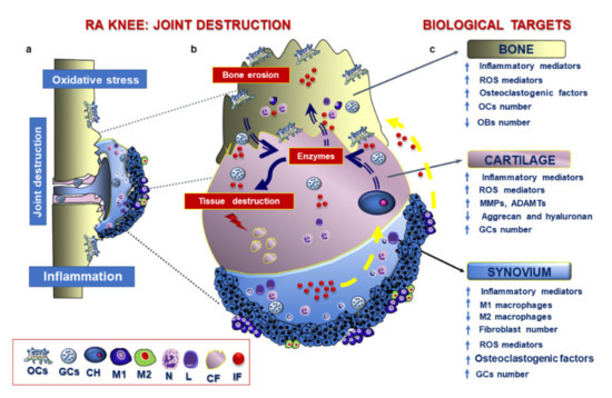 Graphical representation of processes in RA knee and potential biological targets. (a) RA displays inflammatory, catabolic and oxidative processes in the synovial membrane, subchondral bone and articular cartilage. (b) A high-magnification view of processes implicated in joint destruction. Synovial membrane displays hyperplasia of the lining layer and marked activation of neutrophils, lymphocytes and M1 macrophages, which release inflammatory factors (IF). The phlogistic environment in the synovial membrane (yellow arrow) fosters the release of several matrix-degrading enzymes by chondrocytes (CH) and the release of osteoclastogenic cytokines by giant cells (GCs). These factors trigger the destruction of both bone and cartilage fragments (CF). The inflammatory milieu still fed by GCs amplify this vicious circuit (c) List of main biological targets in the bone, cartilage and synovium. OCs: osteoclasts; GCs: giant cells; CH: chondrocytes; M1: M1 macrophages; M2: M2 macrophages; N: neutrophils; L: lymphocytes; CF: cartilage fragments; IF: inflammatory factors.