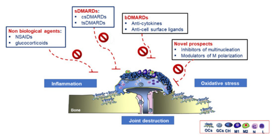 Identifying potential new therapeutic candidates for RA is a challenge among clinicians because of the multi-coloured clinical scenario of patients presenting structural and functional joint alterations and many systemic effects [177]. Despite their promising clinical outcomes, the use of anti-resorptive drugs targeting OCs is inadequate [182]. Currently, disease-modifying anti-rheumatic drugs (DMARDs) are among the first-line strategies for RA treatment. This class of drugs target inflammatory reactions [177]. An alternative classification system distinguishes conventional synthetic chemical compounds (csDMARDs) and targeted synthetic DMARD (tsDMARDs) [183]. Despite the effects of DMARDs on the phlogistic environment, they display several contraindications and side effects, as they interfere with the immune system by enhancing the susceptibility to infections [175]. Accordingly, research efforts generated a new class of drug, biological DMARDs (bDMARDs) treatments, which envisage the use of biological agents [184,185]. (Figure 6). Methotrexate (MTX), firstly used for RA treatment, inhibits the proliferation of inflammatory synovial cells and reduce macrophage and lymphocyte recruitment functions [175]. JAK inhibitors are a class of tsDMARDs, which block the JAK/STAT signalling pathway involved in the signalling transduction of several cytokines [186]. This pathway, composed of JAK1, JAK2, JAK3, and the tyrosine kinase 2 (TyK2), mediates intracellular signals through the transcription factor, STAT [187]. Tofacitinib and baricitinib are two JAK inhibitors approved by the Food and Drug Administration/European Medicines Agency (FDA/EMA) for RA treatment, which impair T lymphocyte RANKL production but not OCs differentiation and function [188] and promote bone formation and repair [189]. Autophagy regulates the innate and adaptative immune system and plays a crucial role in osteoclastogenesis [180]. In an arthritis model, the inhibition of autophagy contributed to reducing bone erosion and OCs number; suggesting its potential role in bone degradation [190]. In this light, drugs lowering autophagy might be another alternative to prevent bone resorption. bDMARDs can be divided into different subfamilies depending on their biological targets. They can include monoclonal antibodies (mAbs) and modified proteins targeting either cytokines or cell-surface molecules [191]. Inhibiting inflammatory cytokine with an osteoclastogenic profile can be a valid approach for blocking OCs-mediated bone resorption; thus, preventing focal bone loss. TNF inhibitors were among the first bDMARDs. Over the last years, scientists developed five main TNF-α inhibitors [192]. Tocilizumab is a humanised monoclonal antibody specific to IL-6R used as monotherapy or with MTX [161]. bDMARDs can also target cell surface molecules. In this light, modulating RANKL/OPG ratio at the pannus-bone interface can prevent bone erosions. Denosumab is a human monoclonal IgG2 antibody against RANKL, which suppress osteoclastogenesis by lowering bone resorption but with no effects on inflammation and cartilage erosion [176]. Targeting cell sources producing inflammatory mediators rather than their final products could be an alternative option due to the growing knowledge of molecules and signalling pathways associated with M1 and M2 [193,194,195,196].