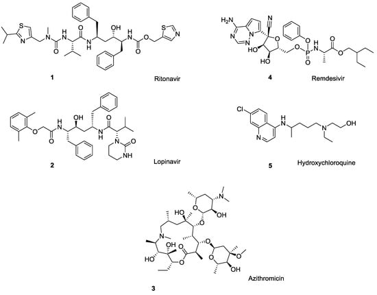 Drugs currently under clinical trials for COVID-19 treatment: ritonavir (1), lopinavir (2), azithromycin (3), remdesivir (4), and the anti-malaria drug hydroxychloroquine (5). All bear ionizable functionalities.