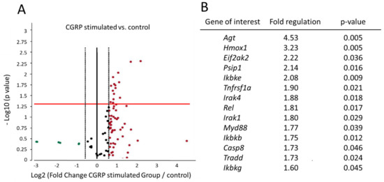 Fold regulation of various genes of NF-κB signaling pathway in the glial cells of trigeminal ganglion (TG) after overnight stimulation with 1 μM CGRP compared to no treatment control group. (A) Volcano plot showing RT-PCR array data to compare the normalized expression of all the genes included in the array between the CGRP stimulated group and control group (no treatment group). The red dots are the genes which were upregulated, and green dots were the genes which were down regulated. The red line shows where p = 0.05 with points above the line having p < 0.05 and points below the line having p > 0.05. Dots above the red line indicate genes-of-interest that display both more than 1.5-fold-changes (x axis) and p < 0.05, statistical significance (−log10 of p value, y axis). Those points having a fold-change less than 1.5 are shown in black dots. (B) Genes-of-interest, which were significantly upregulated after overnight stimulation with 1 micromolar CGRP compared to the no treatment control group. Fold Regulation cut off: 1.5; p-Value cut off: 0.05, n = 3.