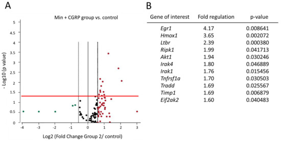 NF-κB signaling genes which were differentially upregulated (fold regulation > 1.5, and p < 0.05) in Min + CGRP group are: V-akt murine thymoma viral oncogene homolog 1 (Akt1) (kinase, fold regulation = 1.94, p = 0.030), early growth response 1 (Egr1) (transcription factor, fold regulation = 4.17, p = 0.008), lymphotoxin beta receptor (TNFR superfamily, member 3) (Ltbr) (NF-κB ligand and receptor, fold regulation = 2.39, p < 0.001), receptor-interacting serine-threonine kinase 1 (Ripk1) (downstream signaling gene, fold regulation = 1.99, p = 0.042), and tissue inhibitor of metalloproteinases 1 (Timp1), (fold regulation = 1.69, p = 0.007). Certain genes whose expression level was significantly upregulated (fold regulation > 1.5, p < 0.05) in the CGRP group was also upregulated in Min + CGRP group) and were Eif2ak2 (fold regulation = 1.60, p = 0.040), Hmox1 (fold regulation = 3.65, p = 0.002), Irak1 (fold regulation = 1.76, p = 0.015), Irak4 (fold regulation = 1.80, p = 0.046), Tnfrsf1a (fold regulation = 1.70, p = 0.031), and Tradd (fold regulation =1.69, p = 0.026) (Figure 2).