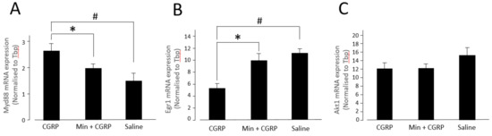 2.3. Effect of IG CGRP Administration and Minocycline Treatment Followed by CGRP Stimulation on the Gene Expression of Myd88, Egr1 and Akt1