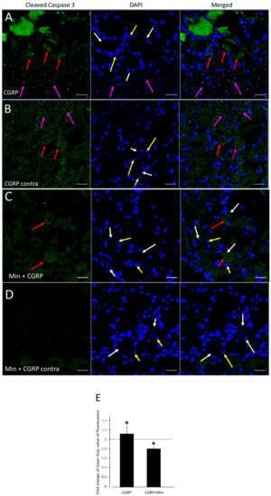Following the NF-κB signaling pathway gene analyses, where fold regulation of Casp8 was found to be increased after CGRP stimulation, change in expression of cleaved Caspase-3 (cleav Casp3) in sections from TG was observed in the animals after IG administration of CGRP and Min + CGRP compared to non-injected ganglion. Confocal images of immunofluorescent staining of TG sections with cleav Casp3 (green immunofluorescence), and 4′,6-Diamidino-2-phenylindole dihydrochloride (DAPI, blue) 6 h after IG CGRP and Min + CGRP administration and non-injected contralateral TGs were observed and staining intensity was compared. Neuronal profiles were identified as the areas (white arrows) surrounded by satellite glial cells (SGC) (yellow arrows). (A) There was an increased in immunoreactivity of cleav Casp3 in CGRP injected sections. The cleav Casp3 immunoreactivity was observed in the neuronal and SGCs cytoplasm (red arrow), whereas as non-neuronal cells showed a colocalization with DAPI (purple arrow), (B) similar distribution pattern was observed in the non-injected contralateral side, but the overall staining intensity was low, (C) and (D) Min + CGRP injected group and non-injected contralateral side showed marked decrease in staining intensity in TG. (E) The average fold change ± SEM of cleav Casp3 staining intensity from control values. A mild but significant increase in fold change in mean grey value of cleav Casp3 was found 6 h after CGRP injection on the injected side compared to the non-injected contralateral side. When Minocycline was injected one hour before CGRP, there was a significant decrease in fold change in mean grey value of cleav Casp-3 on the injected side compared to non-injected side. * p < 0.05 with t test for two dependent means, n = 5. Independent-samples t-test showed no significant difference between CGRP and Min + CGRP injected groups. Scale bar 20 μm.