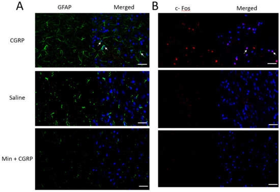 Following the administration of CGRP, Min + CGRP and saline in the TG the change in activity of neurons and astroglial cells in spinal trigeminal nucleus cells was qualitatively observed. Change in expression of glial fibrillary acidic protein (GFAP) in astrocytes, a marker of glial activation and neuronal c-Fos, an early immediate transcription factor and marker of second order sensory neurons in spinal trigeminal nucleus sections of spinal cord obtained from animals with IG administration of CGRP, saline and Min + CGRP was observed. (A) Immunohistochemical staining of spinal trigeminal nucleus caudalis section with GFAP (green) and DAPI (blue). An increase in expression of GFAP (green) in astrocytes (white arrow) in spinal trigeminal nucleus was observed 6 h after IG CGRP administration compared to IG administration of saline or Min + CGRP, (B) An increase in expression of neuronal C-Fos (red) and DAPI (blue) was observed 6 h after IG CGRP administration compared to only saline or Min + CGRP group (white arrow). n = 3. Scale bar 20 μm.