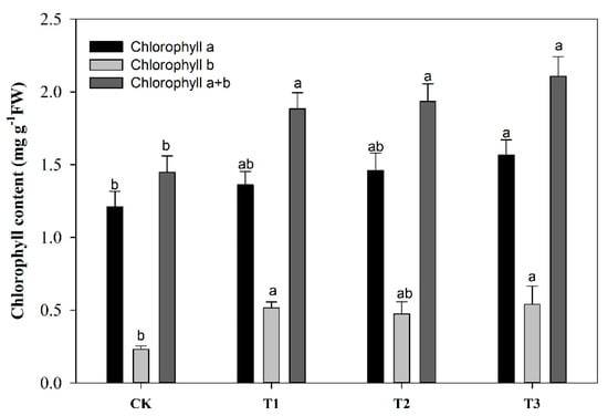 Chlorophyll a (Chl a), chlorophyll b (Chl b) and total chlorophyll contents (Chl a + b) in the leaves of cucumber under different concentrations of garlic substrate. Values represent the mean SE (n = 3). Different letters indicate a significant difference between treatments at p < 0.05, according to the LSD test.