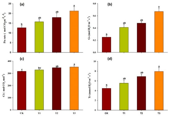 The chlorophyll pigments reflect the plant’s photosynthetic assimilation ability and determine its photosynthetic rate. The contents of chlorophyll a and b and total chlorophyll improved significantly compared to the control, which was consistent with previous assertions [,]. The stomatal aperture, as well as conductance, regulates the intercellular CO2 uptake and H2O2 evaporation in response to eco and biochemical factors. In this study, the stomatal conductance (gs) increased, which regulates gas exchange (CO2 and water) and allows plants to increase their CO2 supply under well-watered growth conditions and further determines Pn behavior. In principle, a higher gs can also be partly responsible for the corresponding increase of the leaf photosynthetic rate that is co-dominantly correlated with the high-yielding capacity of higher plants [].