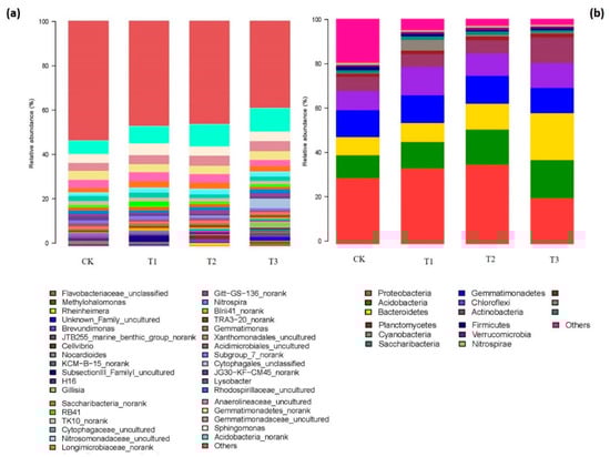 (a) Relative abundances (%) of bacterial community composition at the genus level. (b) Relative abundances of community proportions of bacteria samples at the phylum level under different treatments.