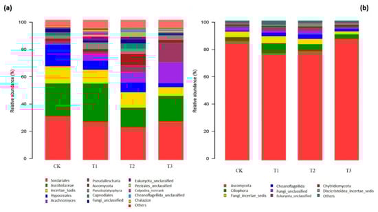 (a) Relative abundances of fungal community composition at the genus level. (b) Relative abundances of community proportions of fungal samples at the phylum level under different treatments.