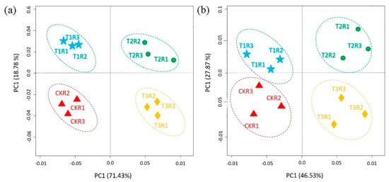 To get a better insight into the differences of the soil microbial community, we applied principal component analysis (PCA) and observed the general difference in the composition of bacterial and fungal communities among the different samples. The four soil samples were distributed separately at 71.43% and 18.78% on the PCA vector 1 and 2 axes for the bacterial community (Figure 5a). Likewise, the PCA variation (46.53% for PC1 and 27.87% for PC2) accounted for the fungal community across all samples (Figure 5b). All the soil samples were distinct from the others, indicating the large community differences under different conditions.