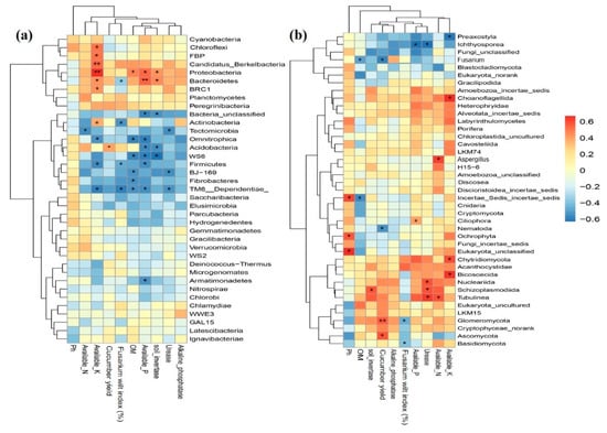 The heat map depicts the relationship of key soil edaphic factors, cucumber yield and Fusarium wilt incidence rate % with top bacterial (a) and fungal taxa (b). Soil samples were clustered using an unweighted pair group method with arithmetic mean (UPGMA) dendrogram based on Bray–Curtis similarities. The color legend and scale are provided in the figure (blue means low relative abundance with negative association while yellow and red mean higher abundance with positive correlation). Shaded values indicate statistically significant (* p < 0.05; ** p < 0.01) associations with correlation.