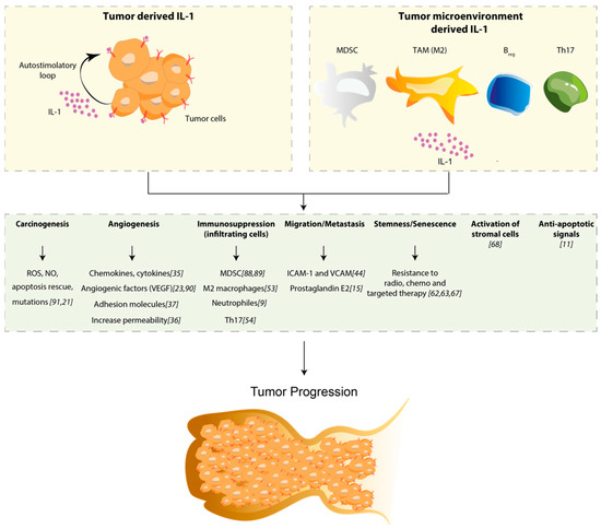 Schematic representation of the role of IL-1 in tumor progression. The upper panel represents two sources of IL-1. Specifically, the tumor-derived IL-1 (upper left) establishes an auto-stimulatory loop that sustains IL-1 synthesis and release, while the tumor microenvironment-derived IL-1 (upper right) arises from immune cells of the myeloid origin: myeloid-derived suppressor cells (MDSC), macrophage-polarized M2 phenotype, regulatory B (Breg) and T helper (Th17) cells. As shown in the figure, the boost of IL-1, released from both tumor and immune cells, induces a wide range of effects: it sustains the production of Reactive Oxygen Species (ROS), and Nitric Oxide (NO) that exacerbate mutation rate rescuing cells from apoptosis; it increases the production of chemokines, cytokines and all adhesion molecules responsible for vascular permeability, leading to angiogenesis and metastasis. It recruits immunosuppressive cells (MDSC, M2 macrophages, neutrophils and Th17) and activates stromal cells in the TME [88,89,90,91]. Finally, IL-1 is described to be involved in drug resistance through the induction of anti-apoptotic signals and senescence.