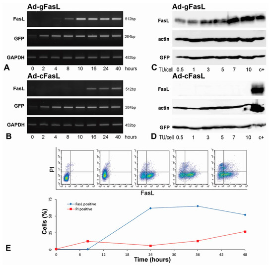 Kinetics of FasL expression in transduced cells: (A,B) Hepa 1–6 hepatocytes were transduced with 5 transfection units (TU)/cell adenovirus carrying (A) FasL minigene (Ad-gFasL) and (B) cDNA (Ad-cFasL). FasL expression was assessed as a function of time after transduction by RT-PCR. Cells infected with Ad-gFasL displayed FasL expression after 8 h, with significant increased FasL level after 10 h (A). The expression of FasL in cells transduced with Ad-cFasL was very low, with delayed onset at 16 h (B). In parallel, expression of mRNA encoding GFP and GAPDH were followed. (C,D) Western blots performed at 40 h after transfection with Ad-gFasL (C) and Ad-cFasL (D) showed FasL protein expression commensurate with mRNA levels and stable GFP expression under all experimental conditions. Hepa 1–6 cells transfected with the pAdTrack-FasL minigene were used as a positive control (c+) in (C,D). The timecourse of the FasL expression on the membrane of transduced Hepa 1–6 cells was also determined by flow cytometry (E). The upper graphs (presented in E) represent the evolution in time of the cell population expressing FasL. Quantification of the flow cytometry experiments is represented in the plot (E, below). FasL is expressed on the cell surface (FasL positive, blue line), reaching approximately 61% at 24 h. However, cell death revealed using propidium iodide (PI positive, red line) increased in time, reaching approximately 25% at 48 h.