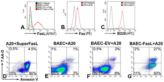 To detect apoptosis induced by FasL, BAECs were transduced with 25 TU/cell for 24 h and thereafter were co-cultured with A20 cells (1:1 ratio) for 24 h. Fas expression was detected on A20 cells using PE-anti CD95 (#152607 BioLegend, San Diego, CA, USA), and B220 was detected using anti B220 (#103260 BioLegend, San Diego, CA, USA) antibody. Cell mixtures were processed for the detection of apoptosis using Annexin V-APC and of cell-death using 7-Amino Actinomycin D (7-AAD), gating on B220+ A20 cells.
