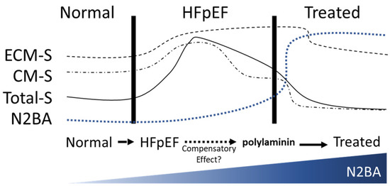 Schematic of the relationship between stiffness and titin-N2BAs during heart failure with preserved ejection fraction (HFpEF) progression, and prediction of its dynamics after treatment with polylaminin. ECM-S, extracellular matrix stiffness; CM-S, cardiomyocyte stiffness; Total-S; total stiffness; N2BA, titin N2BA content.