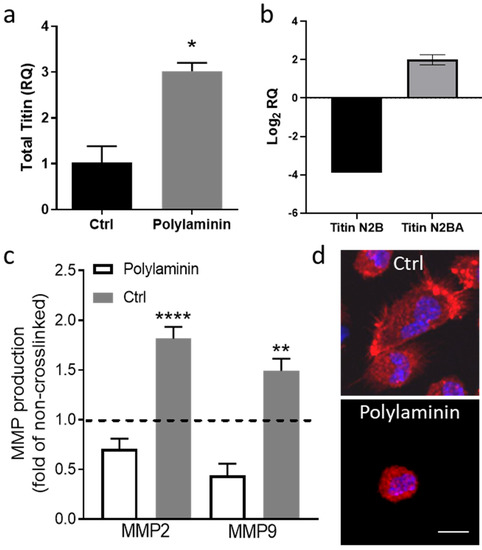 Preliminary data from our group suggest that polylaminin can modulate the relative expression of titin both in vitro and ex vivo (Figure 2). Cardiomyocytes cultured on polylaminin increased their gene expression of total titin (Figure 2a). The intramyocardial injection of polylaminin in ex vivo rat hearts (Langendorff preparation) induced a 1.9-fold increase in titin N2BA expression and a 3.9-fold decrease in titin N2B expression after 4 h (Figure 2b). Aside from the direct effects on cardiomyocyte stiffness, polylaminin has demonstrated immunomodulatory effects in vivo [23]. Analogously, additional in vitro data from our group supported the idea that polylaminin decreases MMP secretion by cardiac fibroblasts (Figure 2c) and shifts macrophage morphology toward the M2 phenotype (Figure 2d).