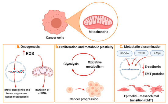 Mitochondrial relevance to cancer progression. Mitochondria play an important role in the main processes that characterize tumor progression. The figure shows the main effects of mitochondria in the three main steps characterizing cancer development: (a) ROS production is capable of causing damage at the levels of nuclear and mitochondrial DNA, thus promoting oncogenesis; (b) metabolic plasticity is responsible for greater tumor progression and stemness; (c) biogenesis and high mitochondrial turnover are responsible for EMT and metastatic dissemination.