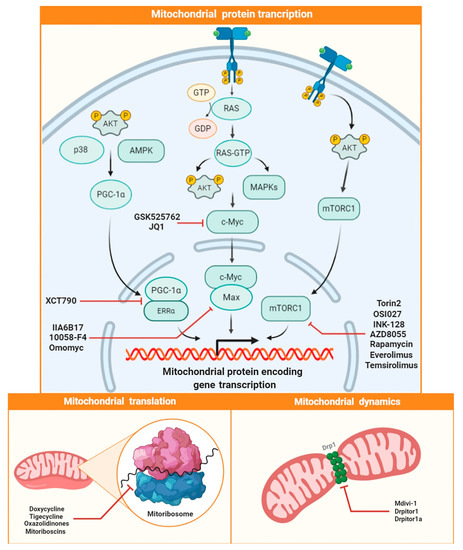 Expression of mitochondrial proteins is a fundamental process supporting mitochondrial biogenesis, and it is transcriptionally regulated by PGC-1α and c-Myc. These proteins can act directly or indirectly (i.e., by interacting with other transcription factors), in order to regulate the expression of numerous genes that encode mitochondrial proteins. On this basis, such proteins are known to be of fundamental importance for the metabolic reprogramming that occurs in cancer cells. Several studies have shown that the increased activation of these pathways in cancer cells stimulates tumor proliferation [118] and survival in anchorage-independent conditions [119], which lies at the basis of neoplastic dissemination [120]. Another fundamental target in mitochondrial biogenesis regulation is represented by mTOR [121,122]. In more detail, mTOR is the catalytic subunit of mTOR complex 1 (mTORC1) and complex 2 (mTORC2), which are downstream components of the PI3K/AKT pathway, playing a central role in controlling cell proliferation and energy homeostasis [123,124].