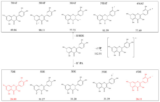 The products formed out of Q by hydrogen atom transfer, electron transfer or proton transfer; and the BDE, IP or PA enthalpies (in Kcal/mol) for the formation of these products. The two products in red are the products formed out of Q by deprotonation (proton transfer) of its 7-OH or 4′-OH group, and the formation of these products appeared to require the lowest reaction enthalpy.