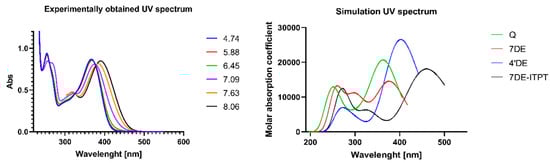 The experimentally obtained UV spectrum of a Q solution (50 μM) in a 50 mM phosphate buffer at various pH values (left panel) and the simulated UV spectra (right panel) of Q and the three energetically most favorable mono-deprotonated forms of Q. i.e 7-OH deprotonated Q (7DE), 4′-OH deprotonated Q (4′DE) and the tautomer of 7DE in which the proton of the 3-OH group is transferred to the 4 oxygen atom (7DE-ITPT).