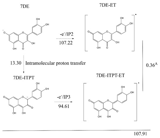 According to the SPLET mechanism, the second step in radical scavenging of Q is the transfer of an electron from 7DE to an oxidizing species. The enthalpy of the electron donation was calculated. The tautomer of 7DE in which the proton of the 3-OH group is transferred to the 4 oxygen atom (7DE-ITPT) was also taken into consideration.