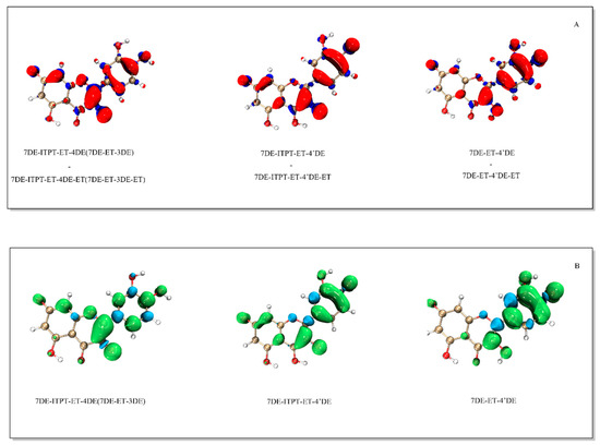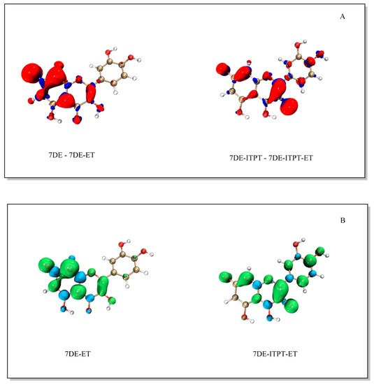 The electron density difference of 7DE with the 7DE-ET radical shows that by electron transfer, most of the electron density is lost on C8, C10 and O7, and on the C2-C3 bond (Figure 4). This indicates that the electron was primarily donated at these positions. The electron density difference of 7DE-ITPT with 7DE-ITPT-ET shows that in 7DE-ITPT, the electron was primarily donated at C2-C3 bond and O3.