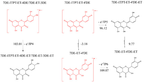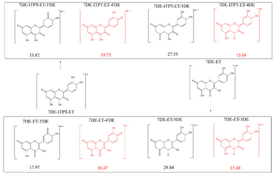 The enthalpy requirement of the deprotonation of the two conformers of the Q radical, 7DE-ET and 7DE-ITPT-ET. The four products in red are the products formed out of both Q radical conformers by deprotonation (proton transfer) of their 3-OH or 4′-OH group, and the formation of these products appeared to require the lowest reaction enthalpy.