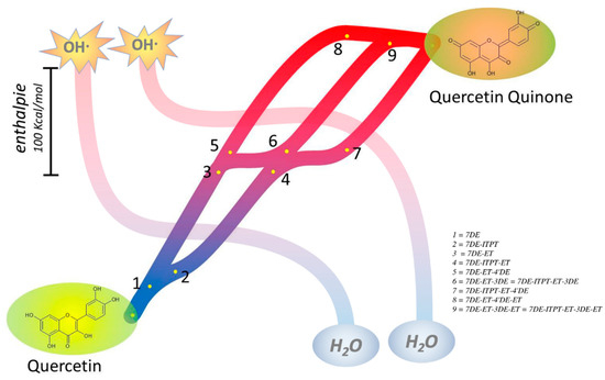 Overview of the main pathways of the flow of the redox energy in Q during its antioxidant activity in water. First, Q is deprotonated at the 7 position to give 7DE (1). Then the pathway spits, due to an intramolecular proton transfer, generating 7DE-ITPT (2). In one pathway, electron transfer coverts 7DE in the Q radical 7DE-ET (3). In 7DE-ET the second deprotonation can take place at the 4′ or 3 position, again splitting the pathway, generating 7DE-ET-4′DE (5) and 7DE-ET-3DE (6), respectively. After the second electron transfer, the quinones 7DE-ET-4′DE-ET (8) and 7DE-ET-3DE-ET (9) are formed. The other pathway starts with the generation of 7DE-ITPT (2). Electron transfer converts 7DE-ITPT in the Q radical 7DE-ITPT-ET (4). The second deprotonation of this Q radical (4) also can take place at two positions. Interestingly, deprotonation of the Q radical (4) at the 4 position generates a molecule identical to 7DE-ET-3DE (6), and here the pathways come together. The second deprotonation of the Q radical (4) at the 4′ position generates a third pathway by the formation of 7DE-ITPT-ET-4′DE (9). After a second electron transfer 7DE-ITPT-ET-4′DE is converted in the quinone 7DE-ITPT-ET-4′DE-ET (Quercetin Quinone). Of the quinones formed, 7DE-ITPT-ET-4′DE-ET (Quercetin Quinone) has the lowest energy content, and ultimately this appears to be the most abundant quinone in the antioxidant activity of Q. In these pathways, Q can pick up the hard energy of e.g., two hydroxyl radicals, and the hard energy is softened before it is passed on into the antioxidant network.